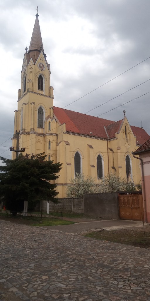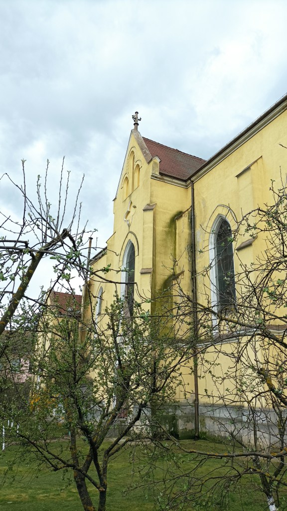 Mi-a atras atenția o matahală de biserică în stil gotic, desigur romano-catolică, atât de mare că a trebuit să trec pe stradă cealaltă ca s-o prind în poză.