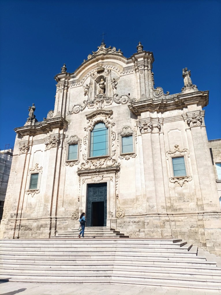 Nu cred că Matera are obiective turistice neapărat de bifat. Aici fiecare străduță, poartă, ușă de intrare în casă, stâncă săpată, clopotniță ori tarabă cu fructe și dulciuri este un obiectiv în felul ei. De cum ajungi în centru, fie că te-mprăstii spre stânga sau spre dreapta, cu siguranță vei da peste ceva care te va lăsa mut de uimire și tâmp în priviri, ca o bovină la termopan. În stânga vezi o ușă albastră și niște cactuși, în dreapta vezi un geam cu un oblon crăpat care te-mbie să privești pervers într-o altă lume. Vezi balcoane cu flori, mușchi pe ziduri, decorurile cele mai retro ori biserici săpate în stâncă. Cică ar fi peste 100 de biserici, în locuri unde nu ai bănui că există așa ceva. Nu le-am numărat.