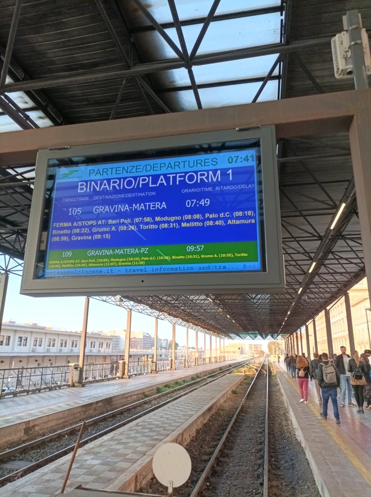 Ca să ajungi din Bari la Matera vei lua trenul pentru o ora și ceva – biletul parcă vreo 5 euro pe sens. Recomand asta pentru că se merge bine la intervale regulate, linia feroviară a fost reabilitată cu bani europeni iar trenurile sunt moderne, curate și circulă după model japonez. Atenție! Cursele sunt operate de o companie privată iar biletele și peronul sunt în altă clădire, cu acces pe undeva prin partea dreaptă cum privești spre Bari Centrale. Bon voyage!…cum ar spune englezul.