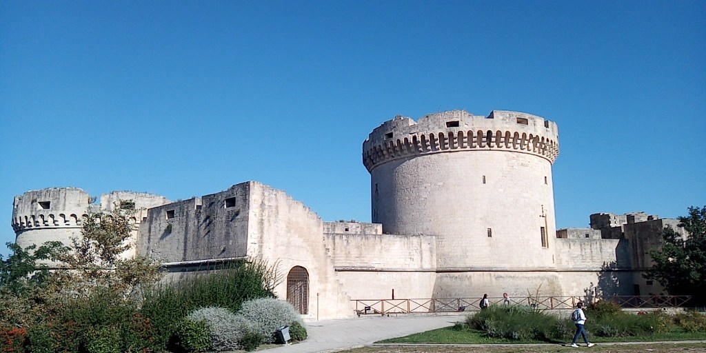 După ce am bătut toate străduțele, cuprins de simțuri mult mai lumești, nesatifacute din principiu și solidaritate cu “Hagi Tudose”(auzi 20 de euro o pizza și 5 o bere!), ne-am retras la umbra din parcul orașului pentru a rupe folia la sandwich-urile luate preventiv la plecarea din Bari. Două sandwich-uri și-o apă la litru aproape șapte euro! Asta da economie, iar faptul că rumegam lângă ruinele Castelului Tramontano, construit în sec. al XVI-lea, îmi dădea un aer de superioritate asupra unora născuti in Bavaria, ce “lopătau” paste și bere, la un piccolo ristorante. Între două-nghițituri mai scăpam și un oftat : unde-o fi blestemăția/de-s născut in România !? Ei lasă, noi să fim sănătoși!