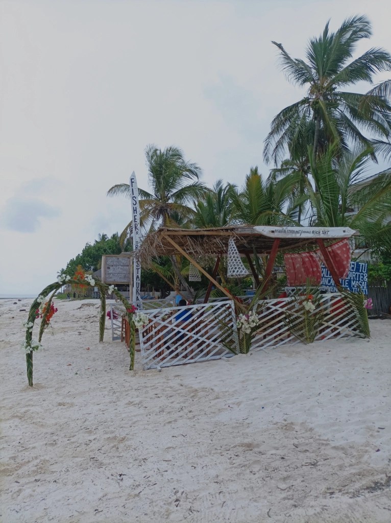 Desigur că are loc și o “negociere” la preț dar tot noi, turiștii, i-am învățat că pot cere și pe dracu` pentru o brățară sau o scrumieră din scoică. Am mers cu el în josul plajei, unde, printre niște cocioabe acoperite cu frunze de palmier, își avea o cămăruță cu ceva marfă, “office-ul” cum îl numea el. Ce e de remarcat pe insula asta e că mai toată lumea pricepe “ingliș” așa că te poți înțelege ușor cu ei, spre deosebire de Europa noastră – îmi amintesc ce greu am găsit în Serbia pe unul care s-o rupă cu engleza… și ăla a dat-o pe românește mai apoi.