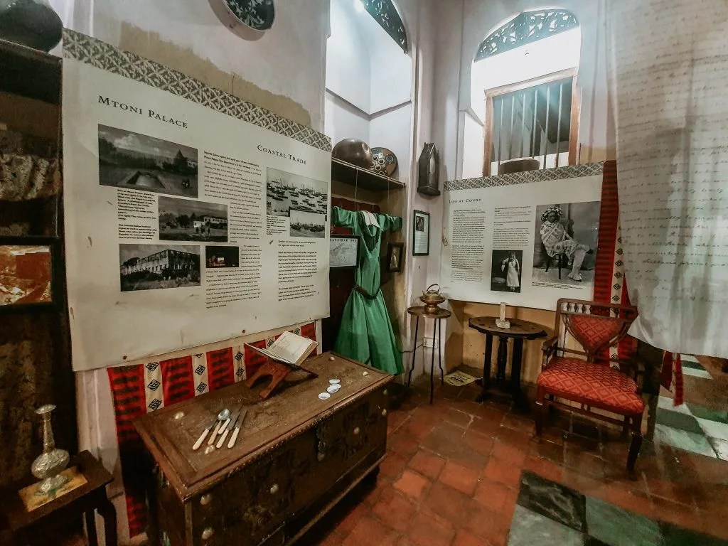 Acum devenit muzeu, palatul a fost construit ca reședință pentru Sultan. Se bucurau de lux sultanii pe aici, aveau o super priveliște de la balcon și lift, ca să nu obosească pe scări. E cam „prăfuit” și pare neîngrijit palatul, dar cu explicațiile ghidei noastre, mai prind viață și exponatele. Sunt destul de multe obiecte pe aici – tablouri, pături, cufere, mobilă, cu care să îți faci o idee despre cum trăiau conducătorii acelor vremuri. Există și o zonă dedicată Prințesei Salme (de care voi aminti mai încolo), iar cartea ei poate fi cumpărată de la ghișeul de bilete, pentru 25$. Jur că nu înțeleg uneori prețurile zanzibarezilor, dacă era mai ieftină poate chiar o luam.