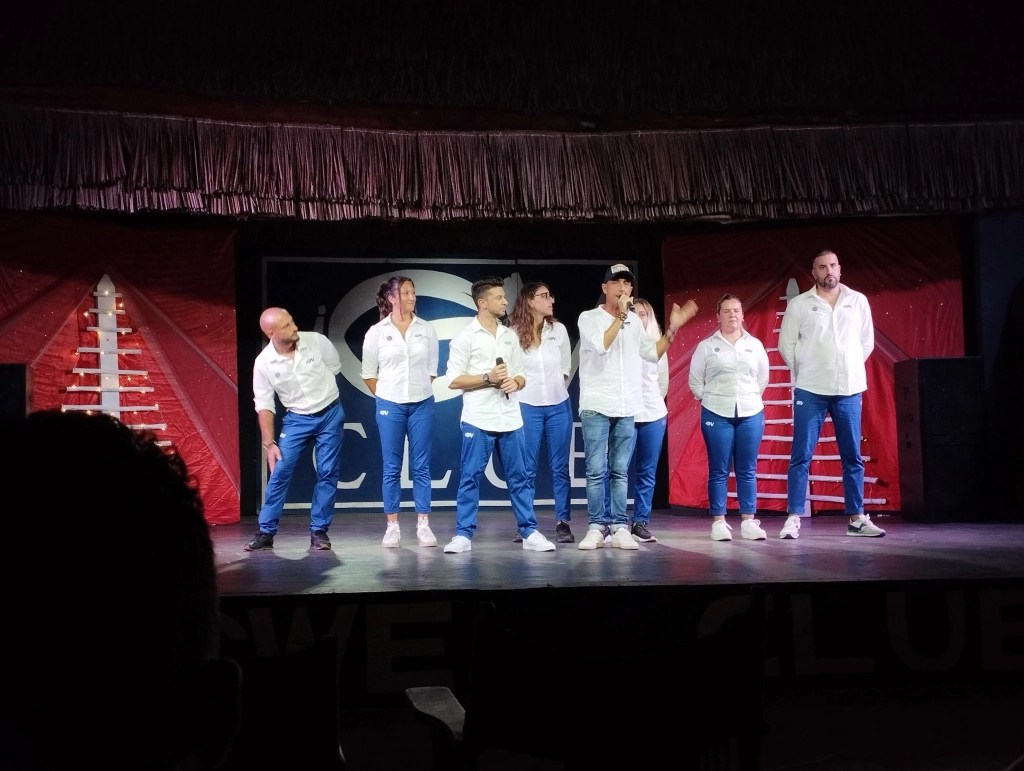 Echipa de animatori – cinci băieți și șase fete, de la I Grandi Viaggi – își făceau treaba atât în cursul zilei, la piscină sau pe plajă, cât și seara prin spectacolele pe care le organizau. N-aveai cum să te plictisești, erau după tine tot timpul, că de la un timp nu mai știam dacă sunt român sau italian. Aveam o pereche de papuci de care voiam să scap, așa că i-am lăsat intenționat pe plajă… nu-ți spun că i-am găsit la ușă, aduși de unul dintre ei? Uite drace, că nu mai scap de ai “scalpeți” ca olteanu’ de sărăcie!