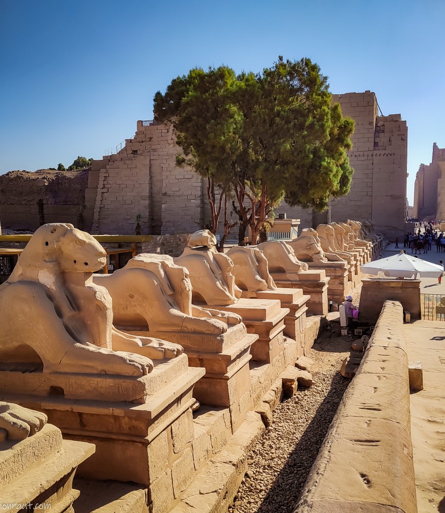 Rezultatul este un labirint incredibil de temple, sanctuare, sfincși, coloane și stâlpi în mijlocul altor construcții antice. Nu vei putea vizita tot complexul, multe clădiri fiind închise vizitatorilor. Nici n-ai avea timp, ți-ar trebui o săptămână cel puțin. Intrarea în complex se face pe Aleea Sfincșilor, flancată pe ambele părți de statuile unor creaturi cu cap de berbec și trup de leu. Această alee de peste 3km lungime lega în trecut templul din Karnak cu cel din Luxor. Trecând pe alee simți cum parcă ți se dă onorul și te mânca pe suflet să-i răspunzi cu un salut.