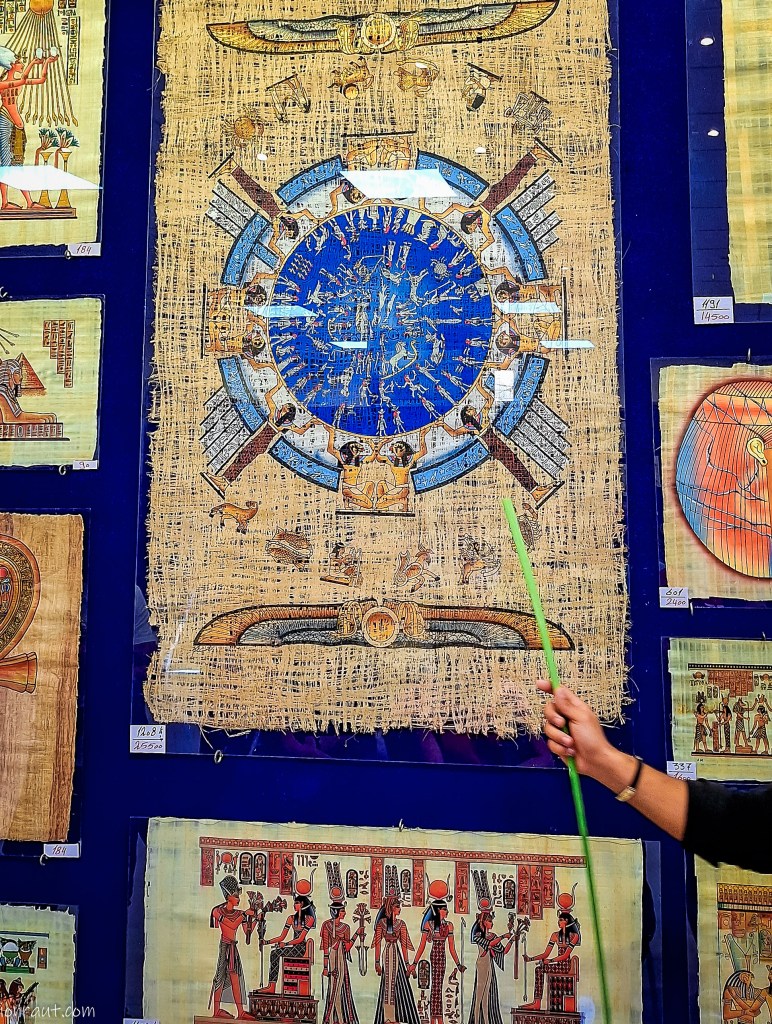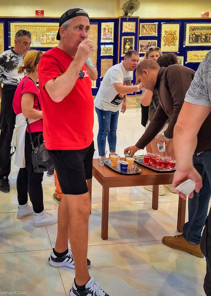 Înainte de a trece Nilul pe partea cealaltă am intrat într-un atelier artizanal ce avea ca obiect de activitate fabricarea papirusului. Primire frumoasă cu un ceai de hibiscus și o demonstrație practică pentru care las un link video mai jos. Doar, doar vom cumpăra câte ceva. Cine mai scrie papirus de când cu FB, Insta sau X? Nu sunt convins că tot ce aveau expus pe pereți era făcut manual, dar las-o așa. Atârnau frumos!