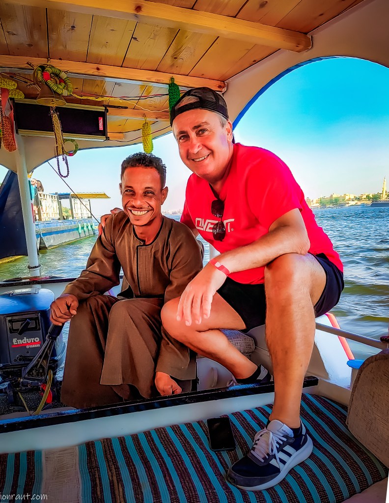 Nilul a însemnat și înseamnă mult pentru Egipt. Si nu numai. De unde s-ar mai aproviziona LIDL cu fasole și cartofi la preț mic, dar înzecind cu adaosul până ajunge noi? Așa că țara asta a fost construită de-o parte și de alta a fluviului, in parte venerat si secat de sevă prin miile de canale pentru irigații. Trecem peste Nil dinspre partea răsăriteană sau „tărâmul viilor” spre „tărâmul morților” din vest. Barca avea un steag neamțesc și un cârmaci cam prea „zâmbăreț” pentru ora aia si nu de la ceai, dar nu mai conta. Nu mai sunt crocodili pe Nil de când cu barajul din amonte, așa că de-o fi să ne răstoarne, facem doar câte o baie. Gratis!